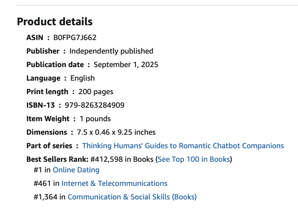 I am actually rather floored! The paperback edition of How to Break Up With a Chatbot: The Thinking Human’s Guide to Managing Digital Desire was #2 in that category two days ago, then yesterday it was #1 and as of this morning, Sept. 19th, it’s still #1.